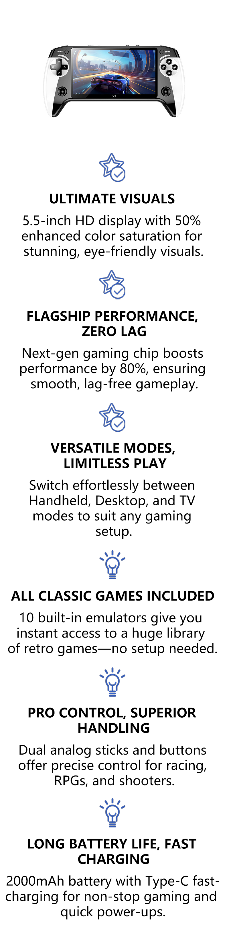 - Wireless Controller Connection - Bluetooth connectivity with no need for cables, providing a lag-free and flexible gaming experience.