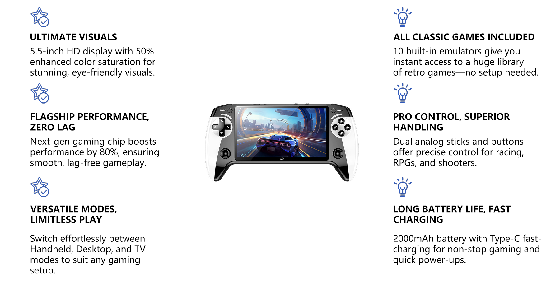 "Play it All," and enjoy a massive library of retro games. Power on with a single touch, relive the golden age of gaming, and effortlessly dominate every battlefield you dreamed of as a kid.